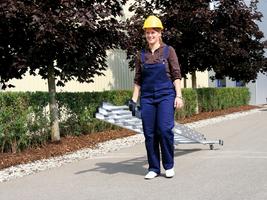 - Die manuell mit wenigen Handgriffen umlegbaren Rollen erlauben das bequeme und rückenschonende Bewegen der Leiter von Einsatzort zu Einsatzort