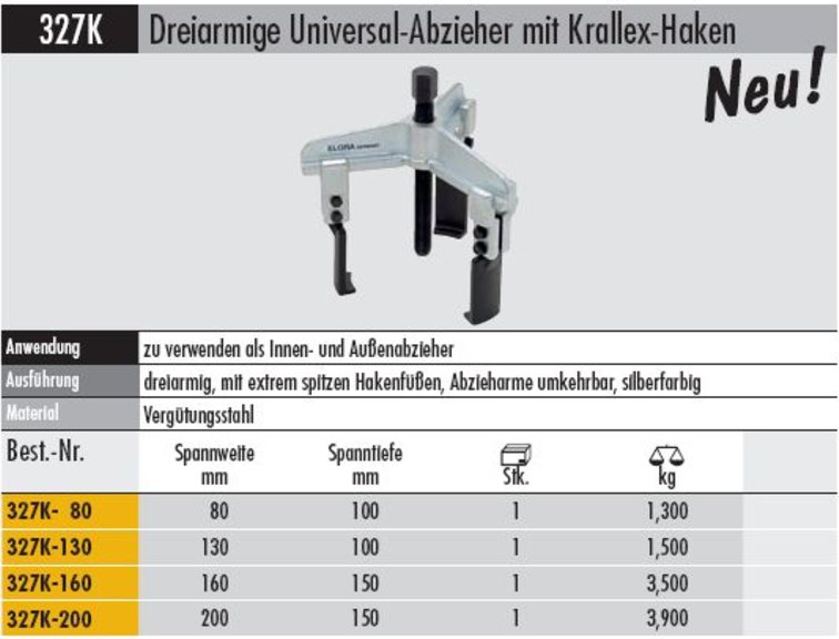 Produktinformationen "Dreiarmige Universal-Abzieher mit Krallex-Haken Spannweite 160 mm"