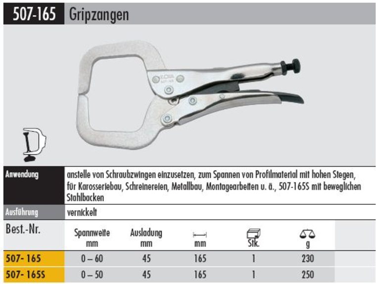 Produktinformationen "Gripzange mit beweglichen Stahlbacken - 507- 165S Spannweite 0 - 50 mm "