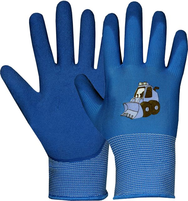 Kinderhandschuh aus elastischem Polyester mit Latex Beschichtung und einem Baggermotiv auf dem Handrücken | |