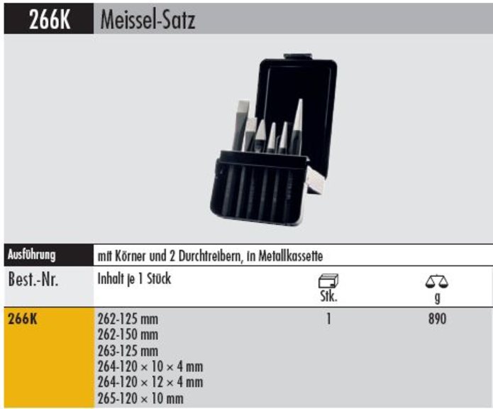 Produktinformationen "Meißel u. Körner-Satz 266 K mit Durchtreiber in Metallkassette"