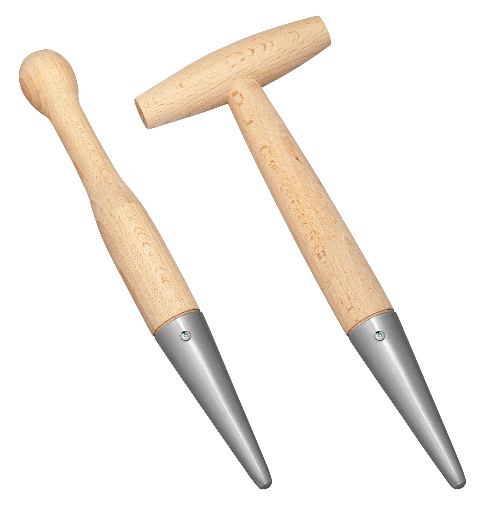 Seine Spitze ist aus Stahl, sein Holzgriff in zwei Ausführungen erhältlich. - Knopf, oder T-Griff