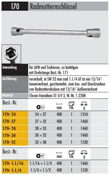Ausführung: vernickelt, in SW 32 mm und 1.1/4 AF ist ein 13/16"-Innenvierkant, geschmiedet, zum Aus- und Einschrauben von Radmutternbolzen mit 13/16"-Außenvierkant