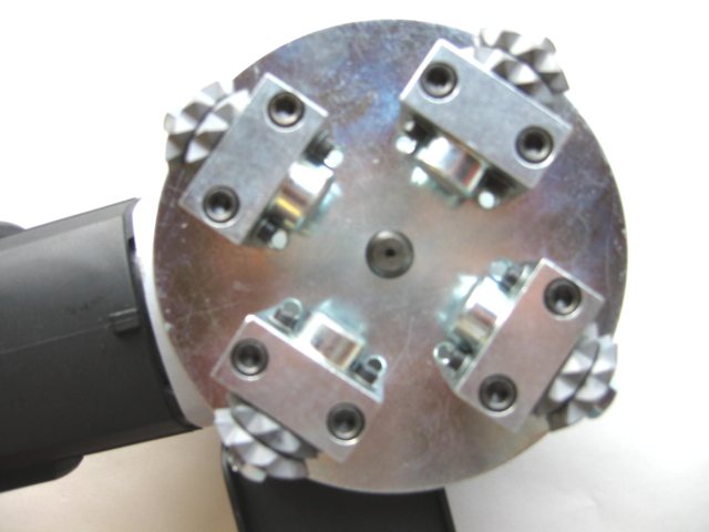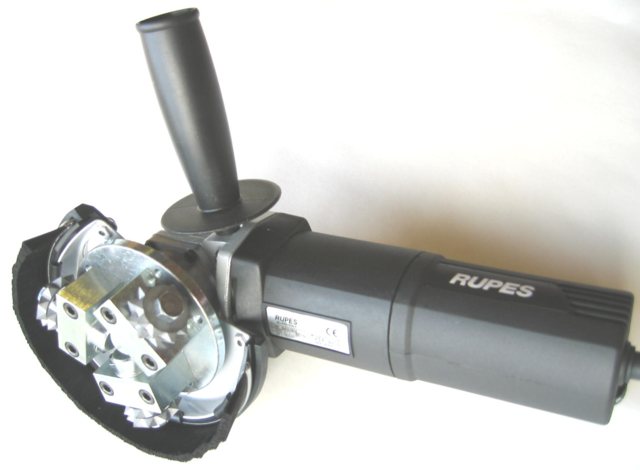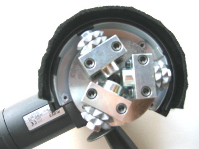 Sie besteht aus einem robusten 900 Watt Winkelschleifer der Marke Rupes und einem rotierenden Stockaufsatz mit Staubschutzhaube, auf dem drei Satelliten mit je zwei gezahnten Hartmetallrädchen befestigt sind. Der Winkelschleifer besitzt eine elektronische Drehzahl-regulierung von 1.500 - 4.000 U / Min. Auf der Oberseite der Staubschutzhaube befindet sich ein Stutzen zum Anschluß eines Industriestaubsaugers. Die Arbeitsleistung ist abhängig von der Gesteinsart: Beton bis ca. 0,5 m2/Min., Kunststein bis ca. 1 m2/Min., Granit bis ca. 0,25 m2/Min.