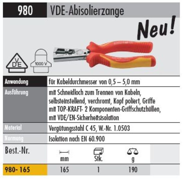 Produktinformationen "VDE Abisolierzange - 980- 165MM selbsteinstellend"
