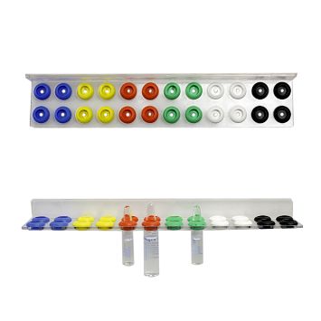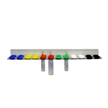 Winkelschienen mit einzelnen, elastischen Ampullenlagern in blau, rot, gelb, grün, weiß, schwarz.