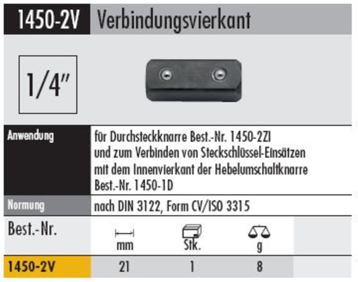 Produktinformationen "Verbindungsvierkant 1450-2V für Durchsteckknarre 1450-2ZI mit 1/4 " Antrieb"