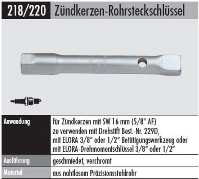 Anwendung: für Zündkerzen mit SW 16 mm (5/8" AF) zu verwenden mit Drehstift Best.-Nr. 229D,