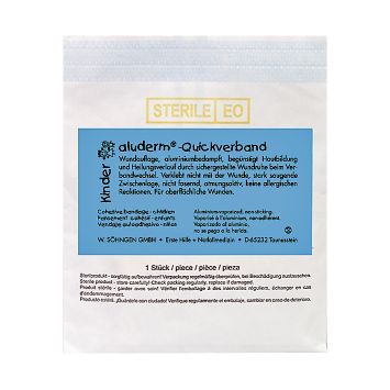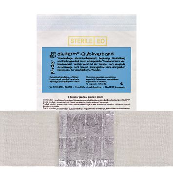aluderm® Kinder-Quickverband. Der absolut unkomplizierte Momentverband. Die aluderm®-Kompresse ist auf einer selbsthaftenden Kohäsiv-Binde aufgesiegelt, eine zusätzliche Endfixierung ist nicht erforderlich. Kindgerechte Abmessungen, einzeln steril verpackt.