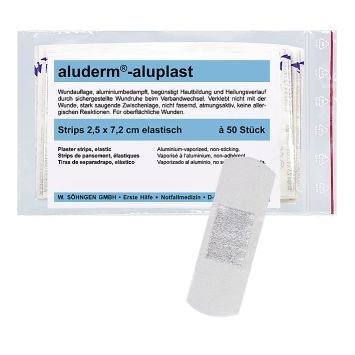 aluderm®-aluplast Strips. Pflaster jeweils einzeln eingesiegelt. aluderm®-aluplast Wundverbandpflaster. aluderm®-aluplast ist das besondere Wundverbandpflaster mit aluminiumbedampfter aluderm®-Wundauflage und Saugvlies. aluderm® verklebt nicht mit der Wunde, fasert nicht, ist stark saugend, kann bei der Hautbildung und Heilung helfen, ist atmungsaktiv.